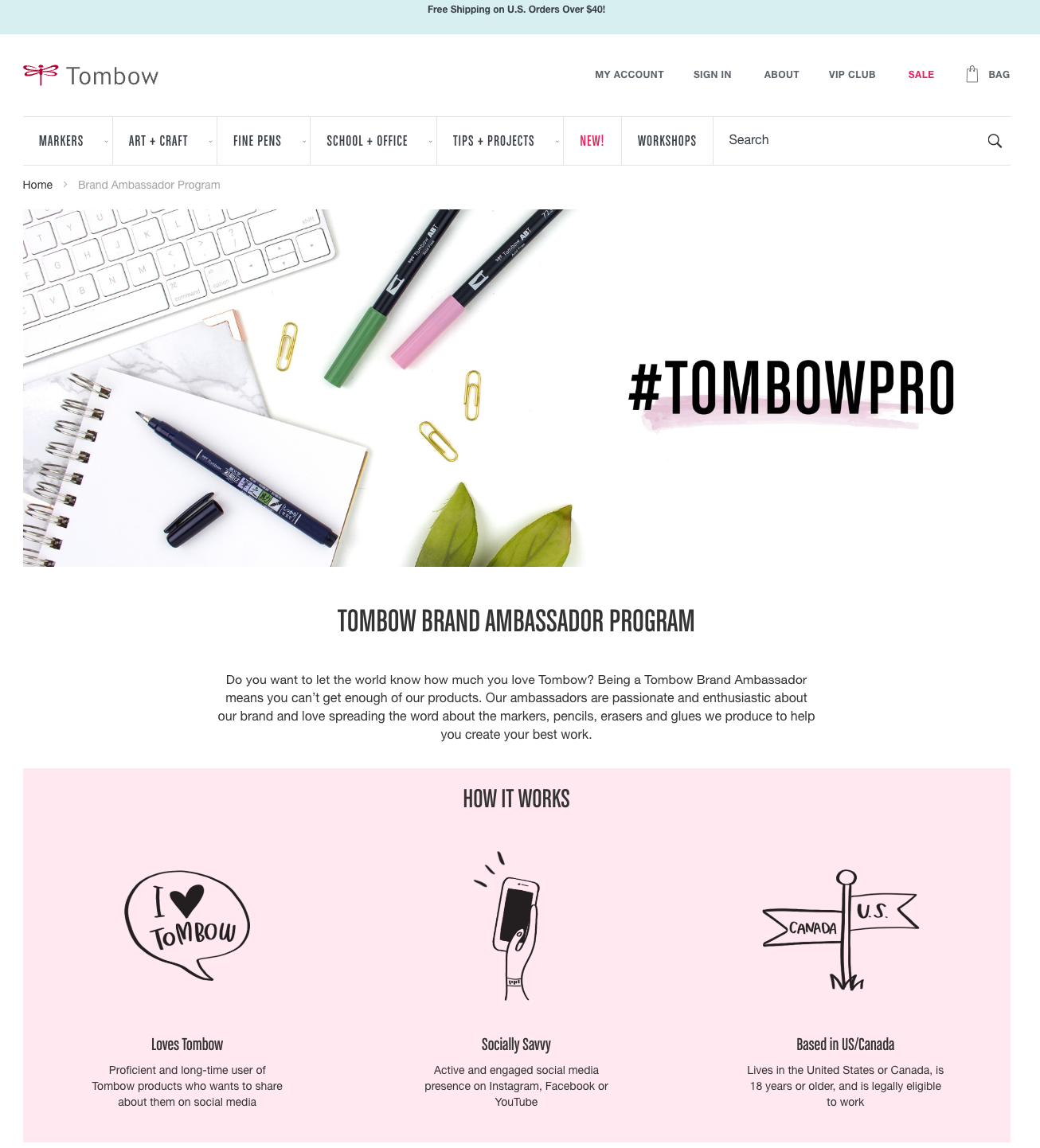 In order to bring more attention to Tombow's Brand Ambassador program and have application information readily available to the public, I worked with my team to develop a landing page for this program.