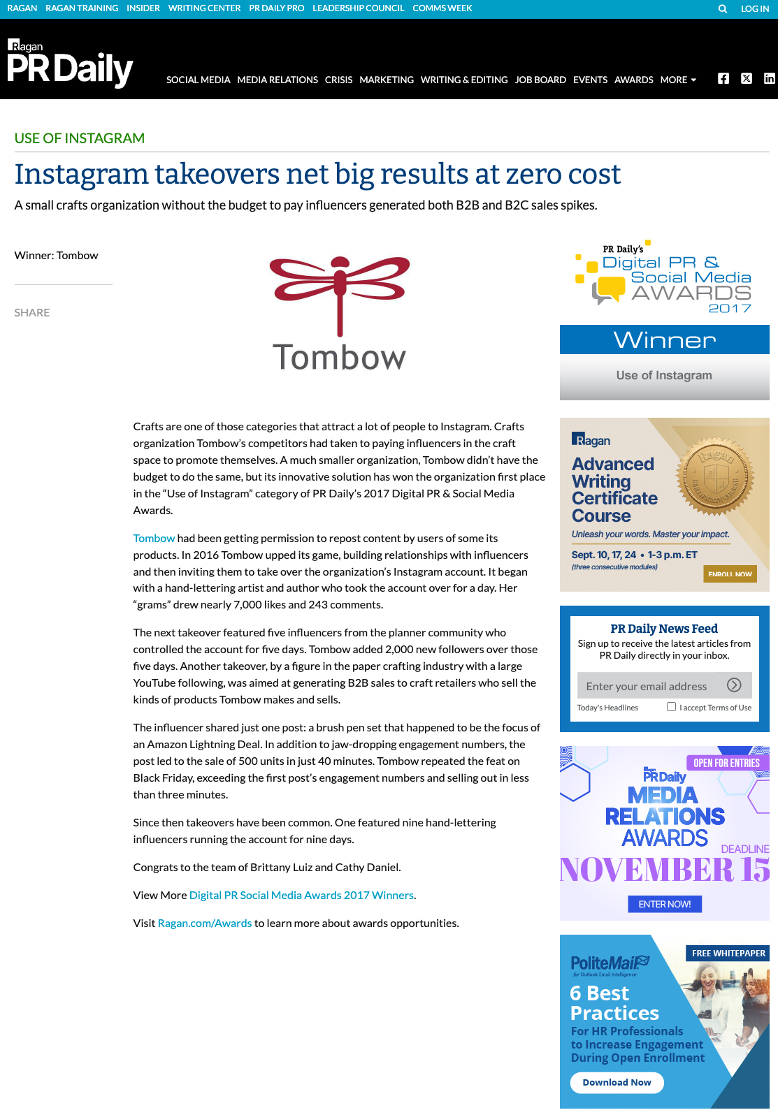 I compiled, designed, and submitted the award package after being contacted by a representative from Ragan PR Daily who felt Tombow's Instagram presence was worthy of submitting for their awards program.